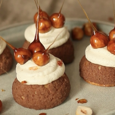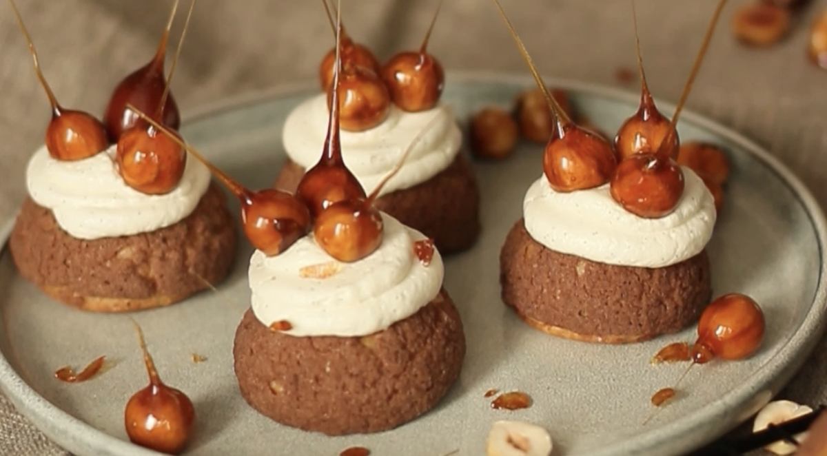 Фундучный ШУ — один из самых любимых, с таким приятным ароматом фундука, воздушным кремом, хрустящей корочкой из Кракелина, а карамелизированные орешки на шапочке — это просто изюминка для пирожного!